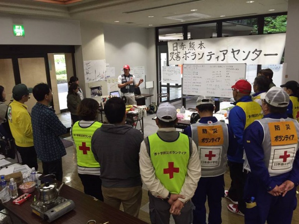 山口赤十字防災奉仕団の藤本委員長ほか4名は、4月22日夜、日赤山口県支部を出発。23日未明に日赤熊本県支部に入った後、支部内に設置された日赤熊本県災害ボランティアセンターを中心に活動しました。