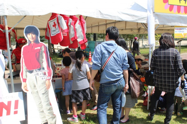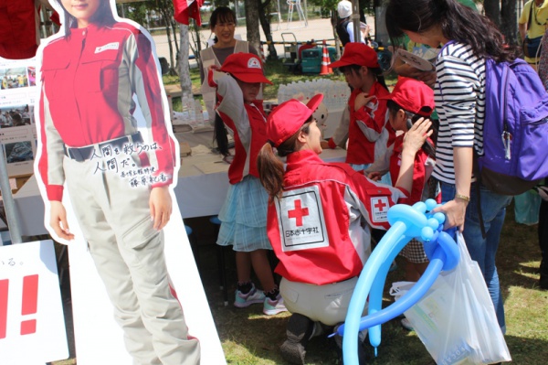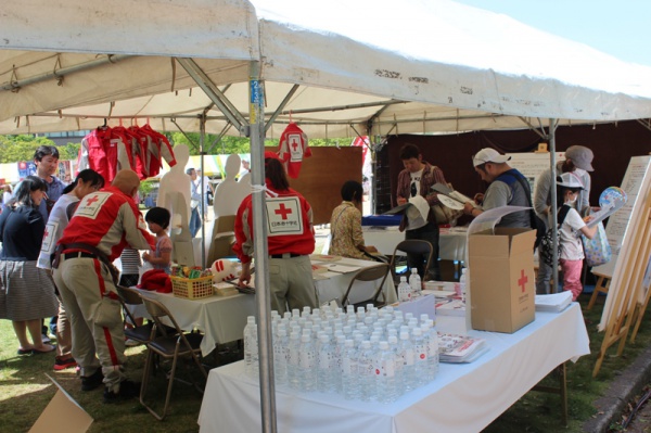 熊本地震に派遣している日赤の救護班の活動をまとめたパネル展示を中心に、将来を担う子どもたちに赤十字の活動を知ってもらうためのクイズや、救護服の試着も行いました。