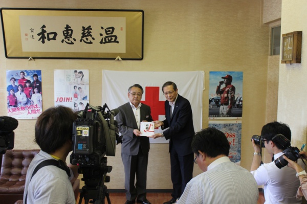 マルキュウグループ様は、4月18日より18日間、マルキュウグループ全店91店舗および関連事業所にて店頭募金を実施されました。多くのお客様より寄せられた募金、200万8863円と、マルキュウグループ様からの義援金500万円を併せて、24日(火)に日赤山口県支部に届けてくださいました。