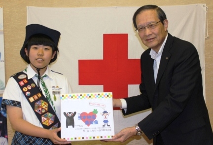 6月6日、周南市を拠点に活動しておられるガールスカウト山口県第三団様が街頭募金などで集められた熊本地震災害義援金61,558円をシニア部門の松田蒼空(みそら)さんが代表して届けてくださいました。