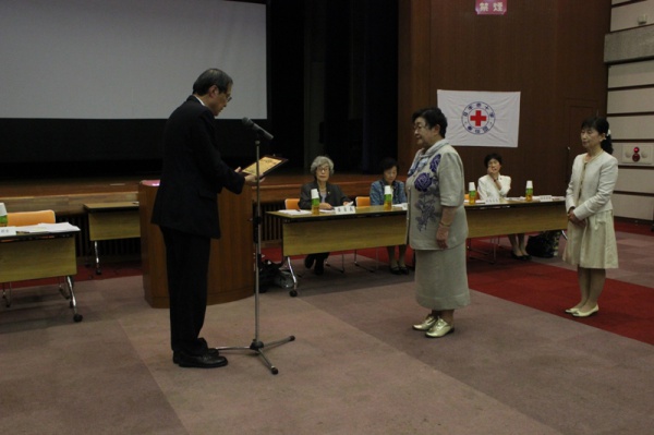 会議の冒頭に赤十字奉仕団結成・活動継続20年以上となる、萩市むつみ赤十字奉仕団、岩国市本郷町赤十字奉仕団の2団に対し、金色有功章をお贈りしました。また、昨年度の中央委員会、中四国ブロック協議会・研修会等の参加者から報告を受けた後、先日完成した「赤十字奉仕団災害時炊き出しレシピ集」を取り入れた災害時における炊き出し活動をどう進めるか等、地域の防災・減災を進める取組みについて、今年度の方針を出席者で共有しました。
