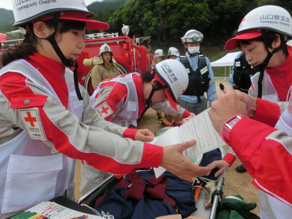 平成28年5月29日(日)、萩市陶芸の村公園をメイン会場に、2016年山口県総合防災訓練が開催されました。大雨による土砂災害や山口県沖日本海を震源域とするM7.5の巨大地震が発生し津波が到達した場合を想定したこの訓練は、各種の災害対応や、平時の防災意識の高揚などを目的とし、日本赤十字社山口県支部からは、医療救護班(医師、看護師、主事の計6名)、萩市および阿武町の赤十字防災奉仕団、山口県赤十字アマチュア無線奉仕団、山口県赤十字防災奉仕団ならびに支部職員がメイン会場での訓練に参加しました。