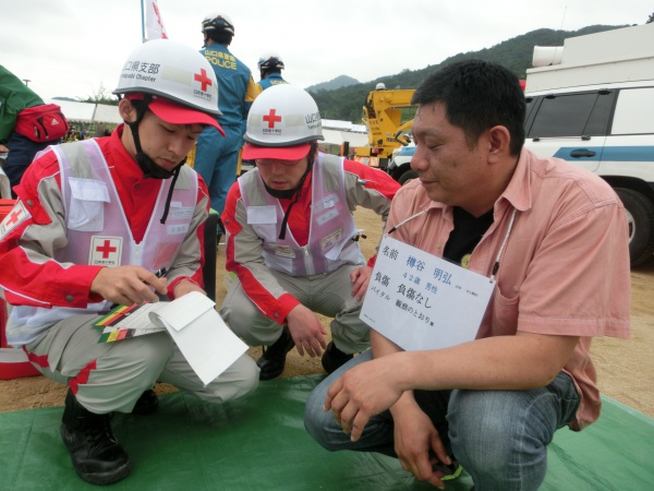 赤十字の医療救護班は、2つのDMAT(災害派遣医療チーム)と協働する訓練を行いました。災害時には、限られた時間・人員・資材等で迅速な治療を行うことが必要なため、トリアージ(重症度・緊急度に応じて治療の優先順位を決定すること)が行われます。今回、赤十字の医療救護班は、多重衝突事故や倒壊家屋から救出された負傷者のトリアージを担当しました。