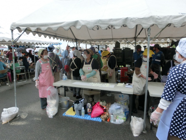 萩市および阿武町赤十字奉仕団は、早朝から非常食(カレー)の炊き出しを行いました。