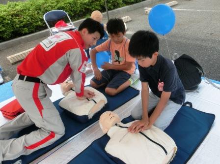 当支部もブース出展の機会をいただき、AED(自動体外式除細動器)を使った心肺蘇生法や、喉に異物が詰まった時の応急処置など、救急法の体験コーナーを実施しました。