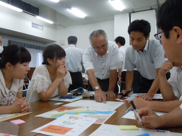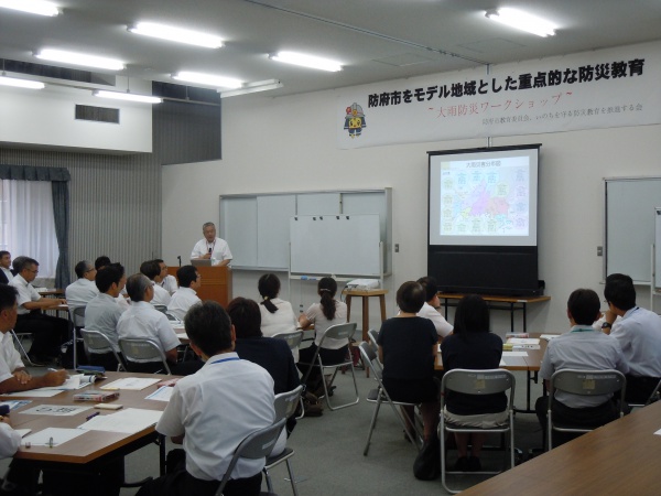 6月27日、この取組みのスタートとして、防府市役所において防府市内の全小・中学校の教職員約30名を対象に「大雨防災ワークショップ」の進め方などについて研修会を開催しました。児童生徒への授業を想定した「大雨防災ワークショップ」を体験した先生からは「災害時に子どもたちが自分たちで考え、いのちを守る行動がとれるよう、積極的にワークショップを進めていきたい」などの感想が得られました。