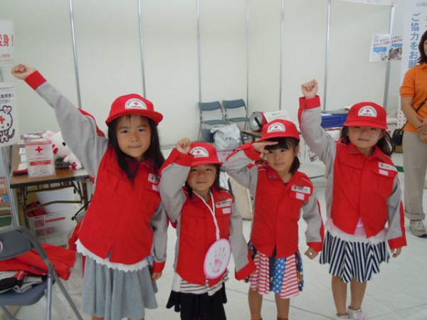 写真(下・右)のお子さまは、赤十字マスコット「ハートラちゃん」のぬいぐるみを気に入ってくれて、一緒に写真をパチリ。また写真(下・左)の女の子たちは、「私たちもこの服を来て、困った人たちを助けに行きたい!」と元気よく手をかかげました。