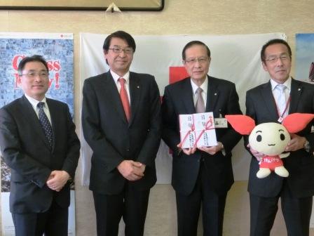 11月16日、生命保険協会山口県協会の入山毅一会長と永岡勇幸事務局長が、職員の皆さま約3,000名から寄せられた募金を、熊本地震災害義援金と日赤山口県支部活動資金としてお持ちくださいました。