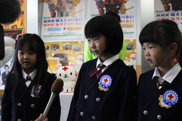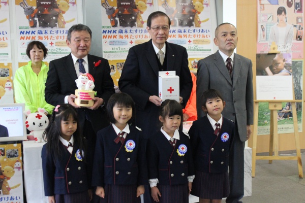 セレモニーでは、青少年赤十字加盟園の山口市藤村学園旭幼稚園の園児さん4名が、声をそろえて「世界の困っている人たちや社会の福祉に役立ててください。」とメッセージを伝え、園で集めた募金を届けてくださいました。