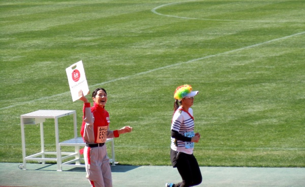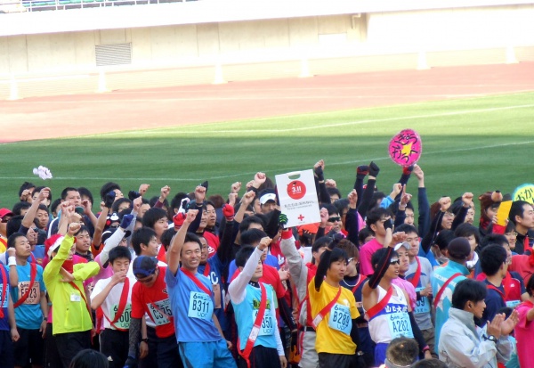 日赤が進めている“私たちは、忘れない。~未来につなげるプロジェクト~”の期間中であり、日赤チームは全員が救護服を着用し、バトンの代わりに「3.11私たちは、忘れない」と書いたメッセージカードを手に、6時間を完走しました。