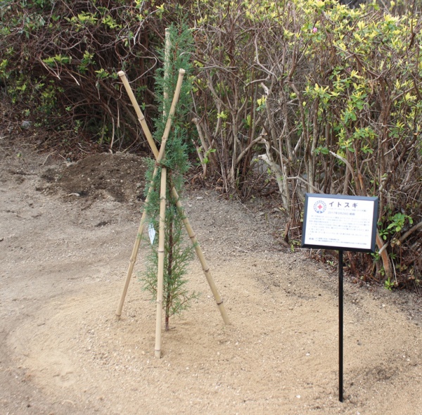 このイトスギ植樹事業は、山口県青少年赤十字賛助奉仕団が山口県日赤紺綬有功会の支援を受け昨年度から開始。青少年赤十字加盟校である山口県立華陵高等学校、山口市立湯田小学校、日本赤十字社山口県支部に続き4本目の植樹となりました。