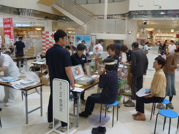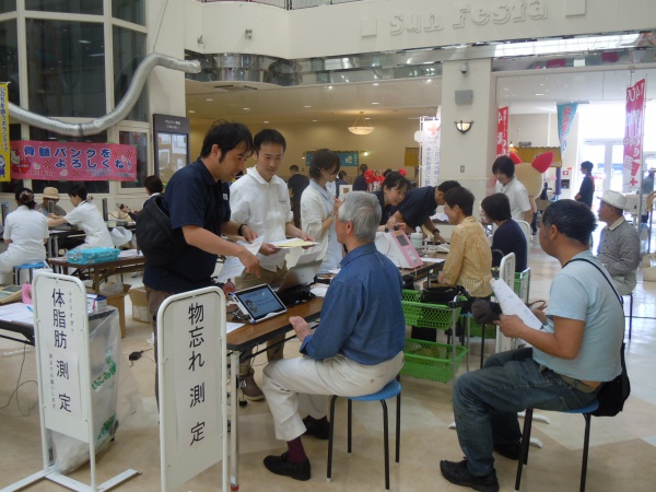 恒例となった小野田赤十字病院看護師、職員らによる健康チェックには行列ができ、中でも今年から新たに追加した物忘れ測定、肌年齢測定、血管年齢測定 が人気を呼んでいました。