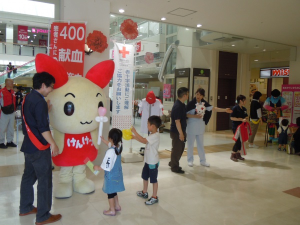 お子さま連れには、救護服やドクター、ナースの衣装が試着できる記念撮影会が好評で、献血マスコットキャラクター「献血ちゃん」も大活躍。地域の皆様に日赤の活動を知っていただき、身近に感じていただける一日になりました。