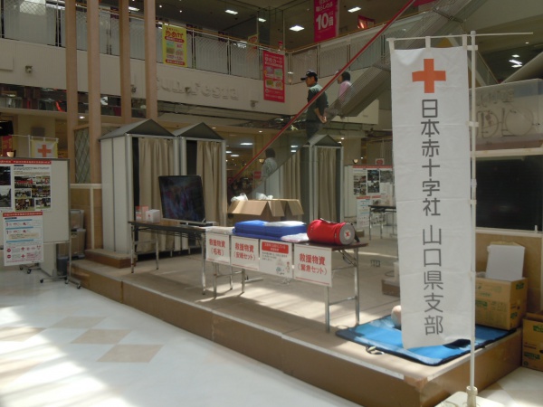 支部では、避難所で配布する救援物資や、昨年発災した熊本地震救護活動のパネルなどを展示。