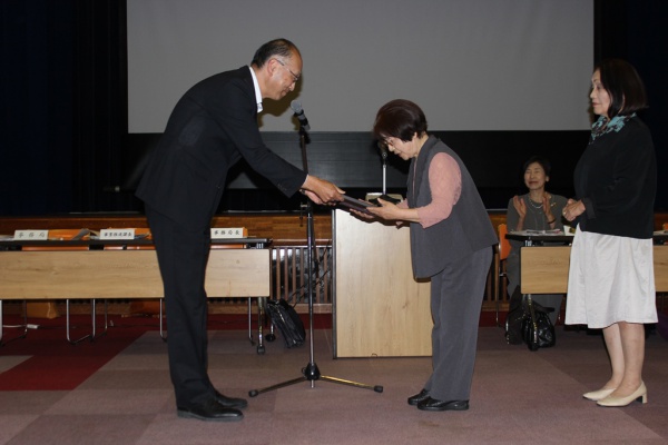 午後からの赤十字奉仕団委員長会議では、地域赤十字奉仕団の委員長と、地区分区(各市町・社会福祉協議会の日赤窓口)担当者等総勢74名が出席。任期満了に伴う役員改選では新しく藤家幸子委員長(萩市旭)が選出され、その後の表章式では赤十字奉仕団結成・活動継続20年以上となる、萩市福栄赤十字奉仕団、岩国市美和赤十字奉仕団、長門市三隅赤十字奉仕団、周南市熊毛赤十字奉仕団の4団に対し、金色有功章をお贈りしました。