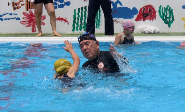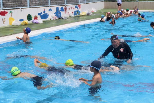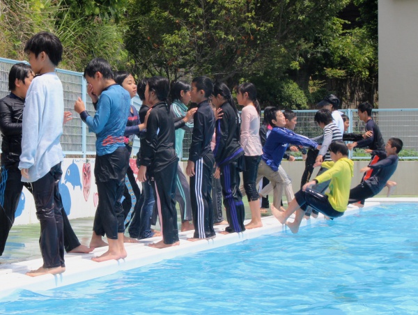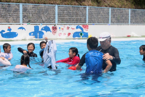 水中で服を脱ぐ難しさを体験した後は、水着になり本格的に泳ぐ練習を行いました。もしもの時のために、泳力を付けておくことが大切です。数時間でみるみる上達する児童らもいて、大変有意義な授業となりました。