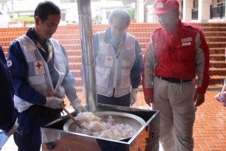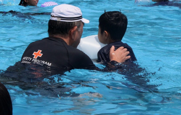 午後からは、プール監視員となる保護者80名を対象に、AEDを使った救急法講習を行いました。