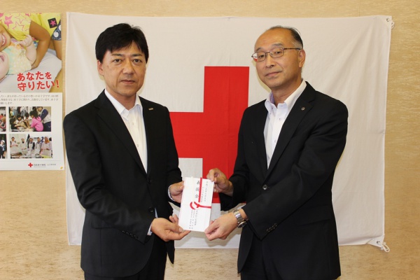 平成29年7月11日、赤十字サポーターの株式会社三宅商事より、葭谷光哉(代表取締役社長 )様と阿寿賀康敏(代表取締役副社長)様が、「平成29年7月5日からの大雨災害義援金」を届けてくださいました。