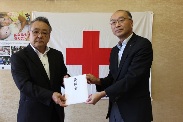 平成29年8月31日(木)、赤十字サポーターである株式会社丸久様から「平成29年7月5日からの大雨災害義援金」として、マルキュウグループの各店舗の募金箱で集められた募金に、丸久様からの拠出金を加えた総額77万円をご寄託いただきました。