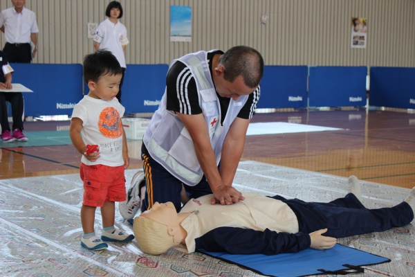 初出場のファミリーチームは、パパとママが救助者役で、お兄ちゃんが救急隊役。弟くんは一生懸命パパの側で応援をしていました。家族揃っていのちを救う・・・素敵です。