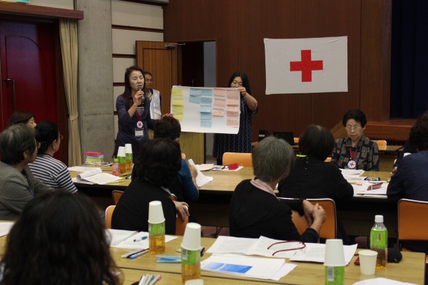 次に、リーダーとしての知識・技術の習得、災害時の奉仕団の活動強化のため、日赤が全国展開している防災プログラムのひとつでもある「災害エスノグラフィー」(読み物による過去の災害の追体験)を山口県赤十字防災奉仕団とともに実施しました。