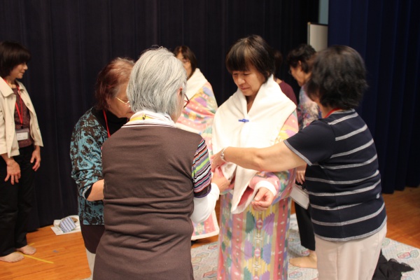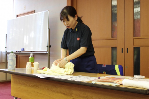 また、災害時に役立つ技術としてホットタオルの紹介、避難所で役立つ毛布ガウンの作り方を、実技を交え講習しました。