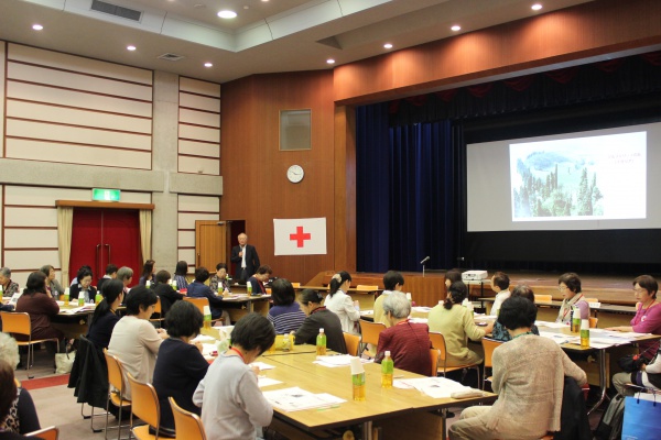 まず始めに赤十字への更なる理解を深めることを目的に、赤十字の成り立ちやマークの意味、赤十字の基本原則等を支部指導講師である蔵本先生からお話しいただきました。
