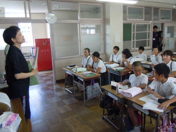 平成29年10月3日、JRC委員会の児童23名が教室に集まり、日赤の健康生活支援講習の指導員による講習を行いました。