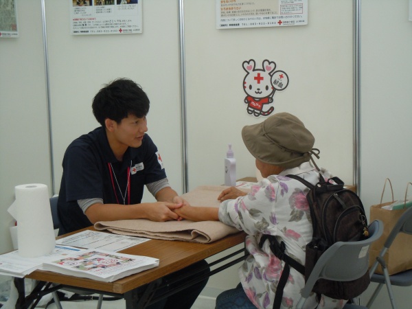 来場者と向き合ってゆっくり話すことができたので、日赤の事業活動や、災害への備えについてお話しさせていただきました。「そんな活動もしちょるんじゃね」「避難所生活は心細いじゃろうから、日赤の人がんばってね」などのお言葉を頂戴し、「あー、気持ちよかった。人の手でさすってもらうとリラックスするねぇ」等の感想がありました。