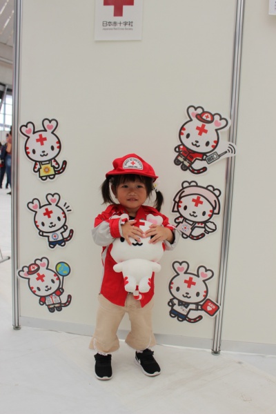 当支部のブースでは、災害時に避難所等で配布する安眠セット(キャンピングマットやアイマスクなどのセット)や緊急セット(携帯ラジオ、懐中電灯、タオル、絆創膏など日用品のセット)、 毛布等の救援物資や、医療救護活動のパネルを展示。また、お子様に救護服を着てもらい、写真撮影などを行いました。