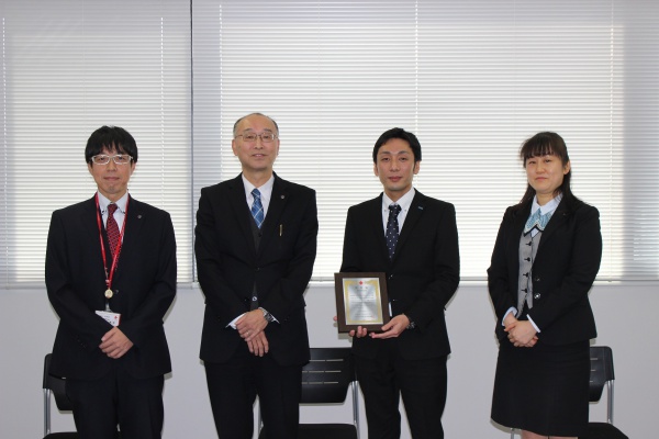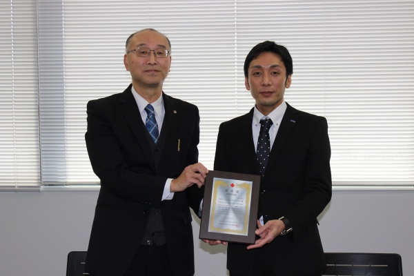 12月21日、山口市の同社山口支店で赤十字サポーター認定証を日赤山口県支部の藤井事務局長から大森隆弘取締役に贈呈しました。