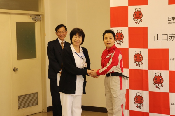 壮行式では、県支部の藤部副支部長、山口赤十字病院名西院長、同大林看護部長らが激励の言葉を述べ、三戸看護師は「尊い命のために最善を尽くす」と意気込みを語りました。