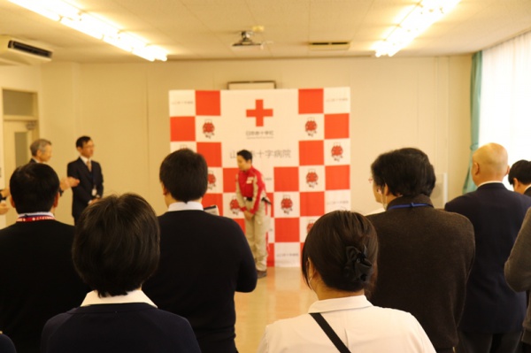 バングラデシュ南部避難民(※1)を支援するための日赤医療チームの一員として、山口赤十字病院の三戸道江(みとみちえ)看護師1名を派遣することとなりましたので、平成30年2月15日、同病院内にて壮行式を行いました。
