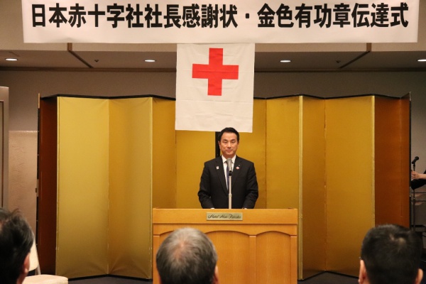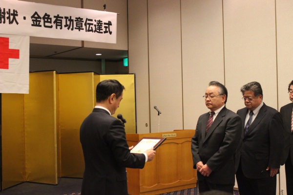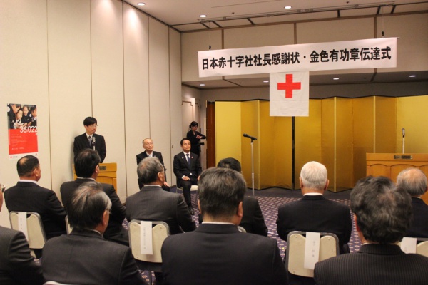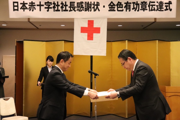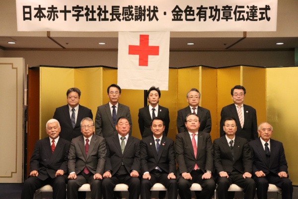 日本赤十字社への寄付に対しては、日本赤十字社や国からの表彰制度があり、県支部ではその表彰制度に基づき、平成26年4月1日~平成29年9月1日の間に、寄付金の累計額が50万円以上に達した方(金色有功章)と、金色有功章受章後に、更に50万円以上のご寄付をされた方(社長感謝状)に対して、表彰をさせていただきました。