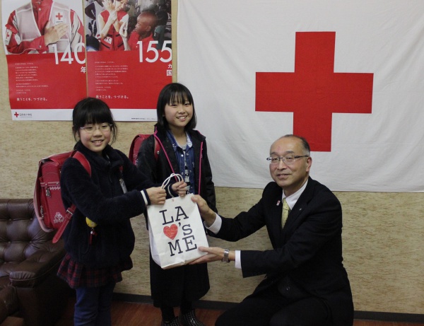 平成30年3月12日、大殿小学校(山口市)のJRC(青少年赤十字)委員会のメンバー2名が、3学期の間校内で集められた1円玉募金を届けてくださいました。