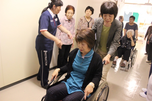 実技研修では、人間の自然な体の動きを意識したベットからの起き上がりの介助方法や、車いすの操作方法等を、団員同士確認し合いながら何度も練習しました。