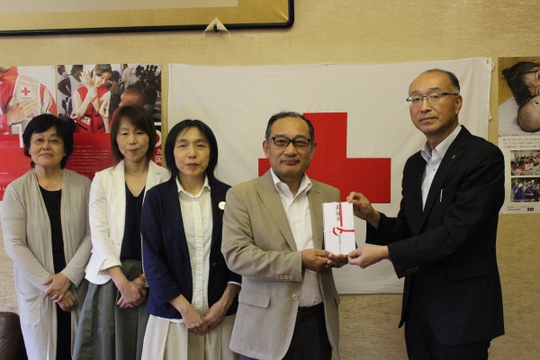 平成30年6月28日、赤十字サポーターである生活協同組合コープやまぐち様より、岡崎 悟理事長、中山 光江参与(日本赤十字社理事)、蔵田菜穂子・柳瀬知美組合員理事が来社され、「平成30年大阪府北部地震災害義援金」20万円を届けてくださいました。