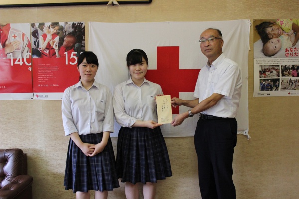 平成30年7月30日、学校法人野田学園高等学校(山口市)の3年7組の生徒代表の2名が、文化祭で出店されたバザーの売り上げ金20,000円を義援金としてお寄せくださいました。