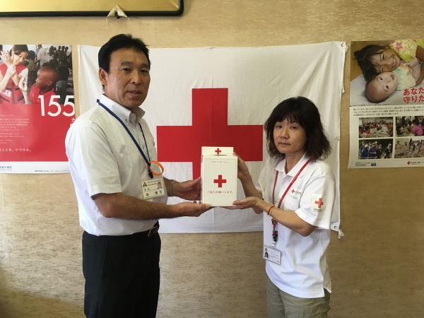 平成30年8月2日、美祢市立於福中学校のJRC(青少年赤十字)部の生徒18名が集めた義援金を、杉 博司校長が届けてくださいました。