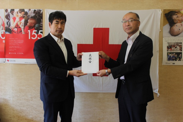 平成30年9月25日、赤十字サポーターである株式会社丸久様より、総務部田中靖士部長が来社され、「平成30年7月大雨災害義援金」として250万円を届けてくださいました。