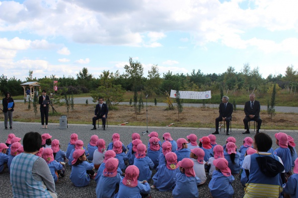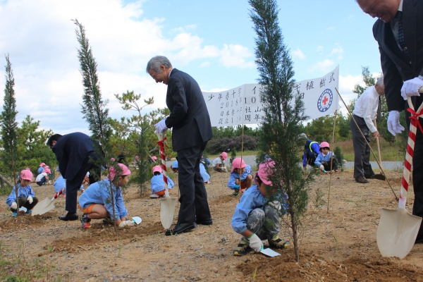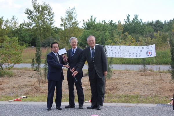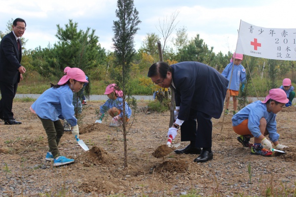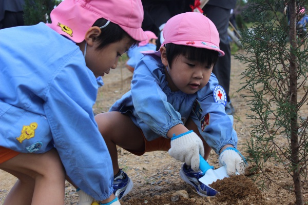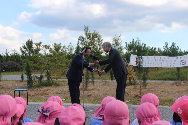 JRC(青少年赤十字)加盟園である阿知須幼稚園(山口市)の年長園児47名と賛助奉仕団により苗木が植えられ、イトスギのように天高くまっすぐ伸びるよう、子どもたちと赤十字の成長への思いが込められました。