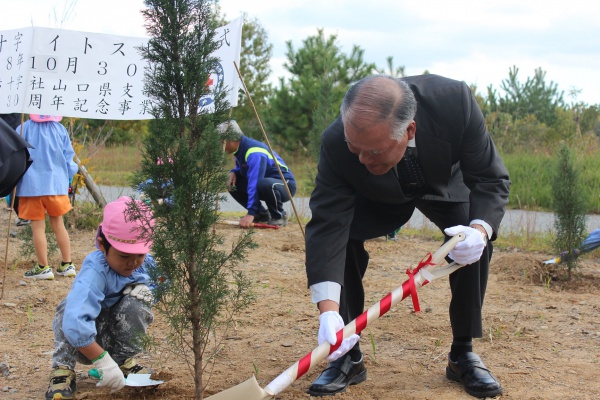 平成30年10月30日、きらら博記念公園(山口市阿知須)で開催中の「平成30年度全国都市緑化祭(山口ゆめ花博)」2050年の森ゾーンにて、山口県支部設立130周年記念行事として「イトスギ」の植樹式を行いました。