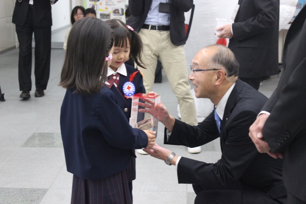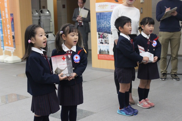 セレモニーでは、青少年赤十字加盟園の藤村学園旭幼稚園(山口市)の園児4名が、声をそろえて「世界の困っている人たちや、日本の福祉に役立ててください。」とメッセージを伝え、園で集めた募金を届けてくださいました。
