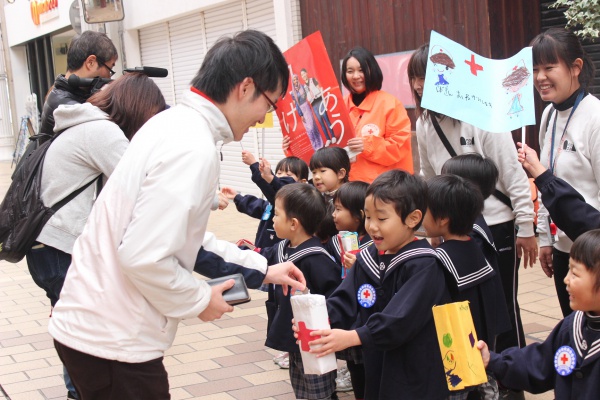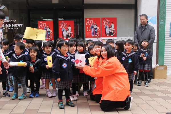 平成30年12月13日、JRC(青少年赤十字)加盟園である野田学園幼稚園(山口市)の年中・年長園児32名と、山口大学学生赤十字奉仕団、山口県立大学学生赤十字奉仕団が、山口市の中心商店街で、海外たすけあい街頭募金を行いました。