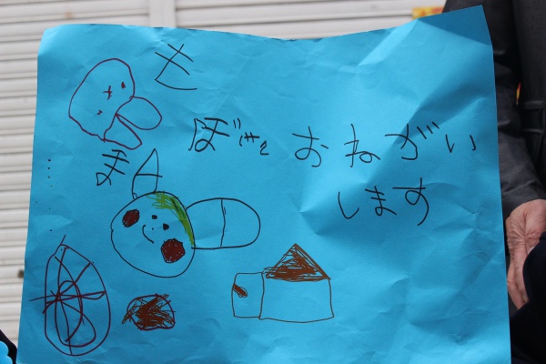 園児たちは、朝から募金箱や旗を手作りし、「募金にご協力ください」の掛け声を練習しました。