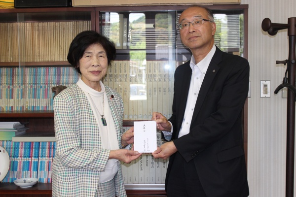 同実行委員会がある施設「カリエンテ山口」では、日ごろから休養・レクリエーション等の場として、婦人の福祉を増進するための事業を行っていますが、その講座講師の方による「和小物」等の売り上げの一部、生徒らが売り上げを義援金に充てるために制作した「毛糸たわし」、また実行委員が家庭から持ち寄ったバザー品の売り上げに、会場募金箱の金額と併せた23,363円をご寄託されました。