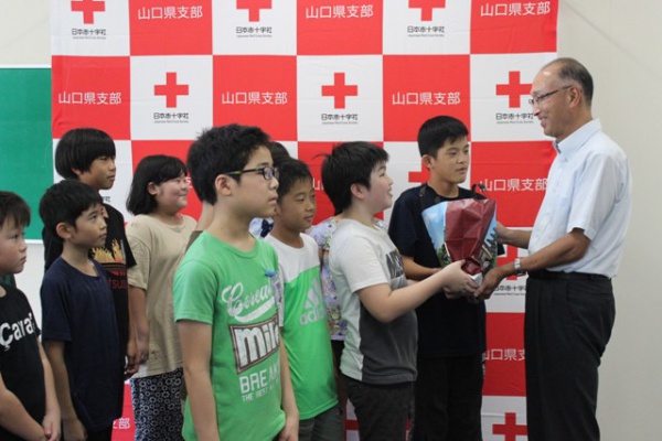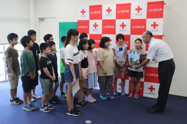 令和元年9月3日、大殿小学校(山口市)のJRC(青少年赤十字)委員会のメンバー20名が、1学期の間校内で集められた1円玉募金、3,585円を届けてくださいました。