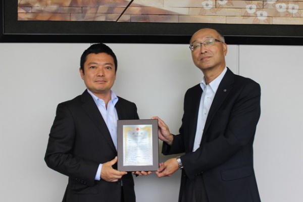 同社は、このたび寄付つき自動販売機の設置をきっかけに、毎年のご寄付の納入および広報のご協力をお約束いただいたことから「赤十字サポーター」への認定申請があり認定させていただくこととなりました。