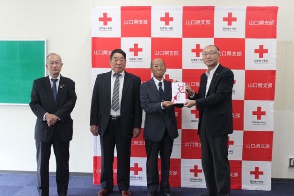 令和元年10月7日(月)、社会福祉法人高嶺会(宇部市)の平野恒二(ひらの こうじ)理事長 、脇 和也(わき かずや)理事 、障害者支援施設 高嶺園 綿谷 強(わたたに つよし)施設長 、並びに正木 嘉勝(まさき よしかつ)副施設長 が来られ、平成30年7月豪雨災害の支援を行う日本赤十字社に対する支援金として、100万円をご寄付いただきました。