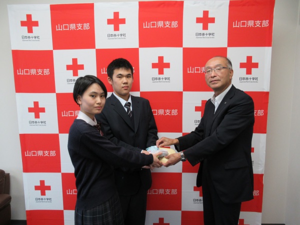 令和元年10月30日、野田学園高等学校(山口市)の生徒会から、朝間將仁(あさまゆきと)生徒会長と河村樹里(かわむらじゅり)生徒副会長の2名が来社され、「令和元年台風第15号千葉県災害義援金」として、44,169円をご寄託されました。